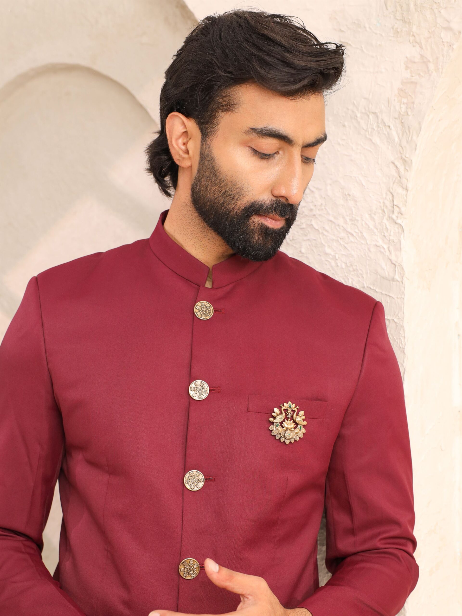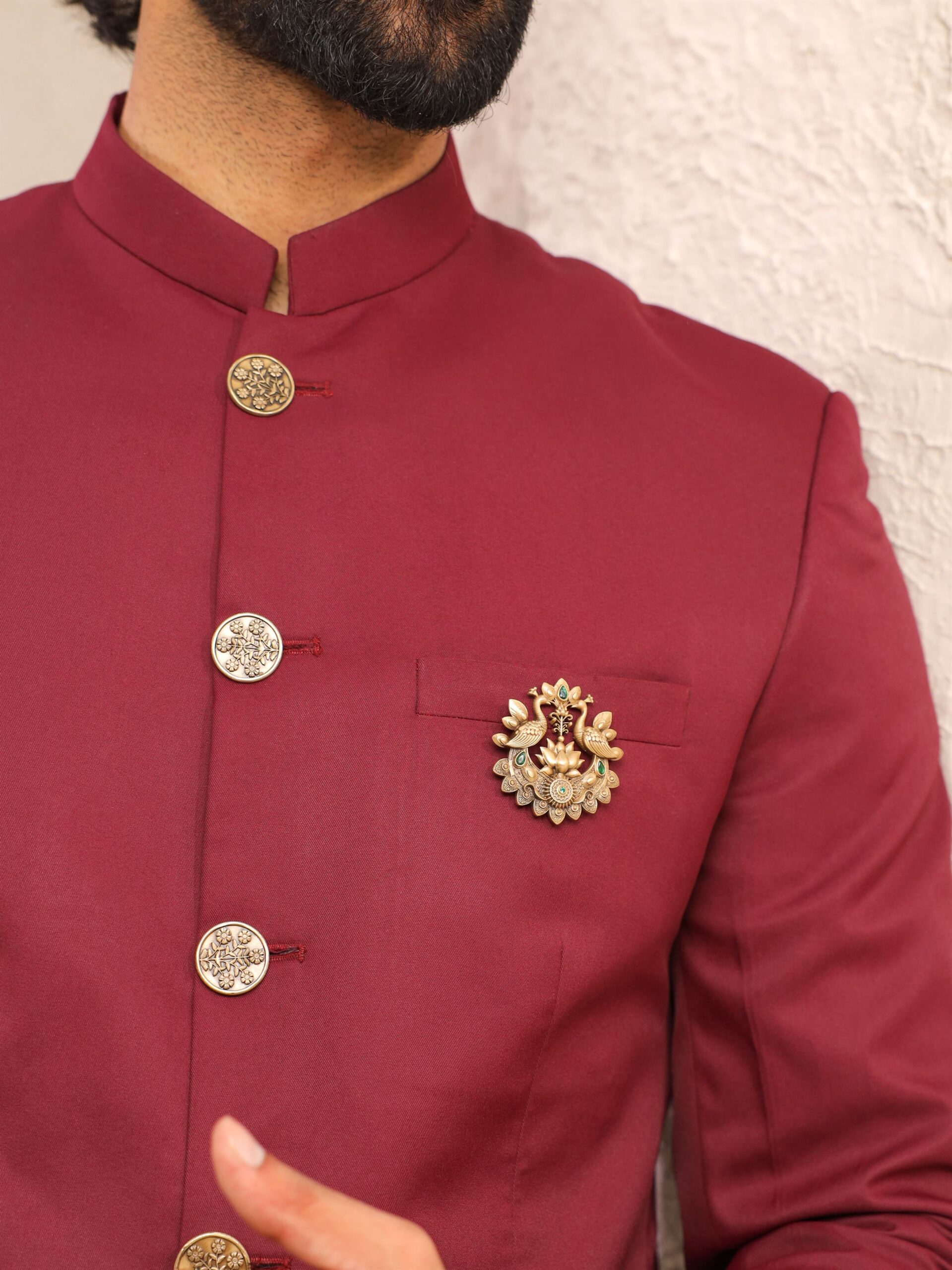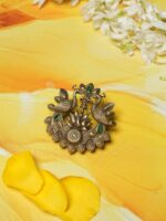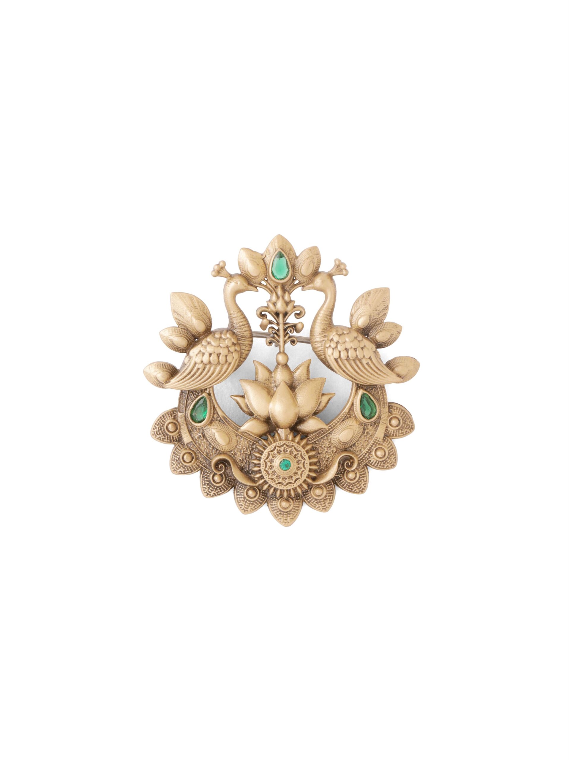 The Eternal Peacocks Brooch is a celebration of beauty, prosperity, and grace. Crafted in antique gold tones, it features two intricately detailed peacocks gracefully poised around a blooming lotus ? a symbol of purity and enlightenment. Accented with vivid green stones, the brooch reflects harmony between artistry and tradition. Designed for men who value cultural heritage and timeless style, this piece is perfect to adorn sherwanis, bandhgalas, or festive ensembles, making it a statement accessory for weddings and grand occasions.
