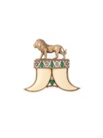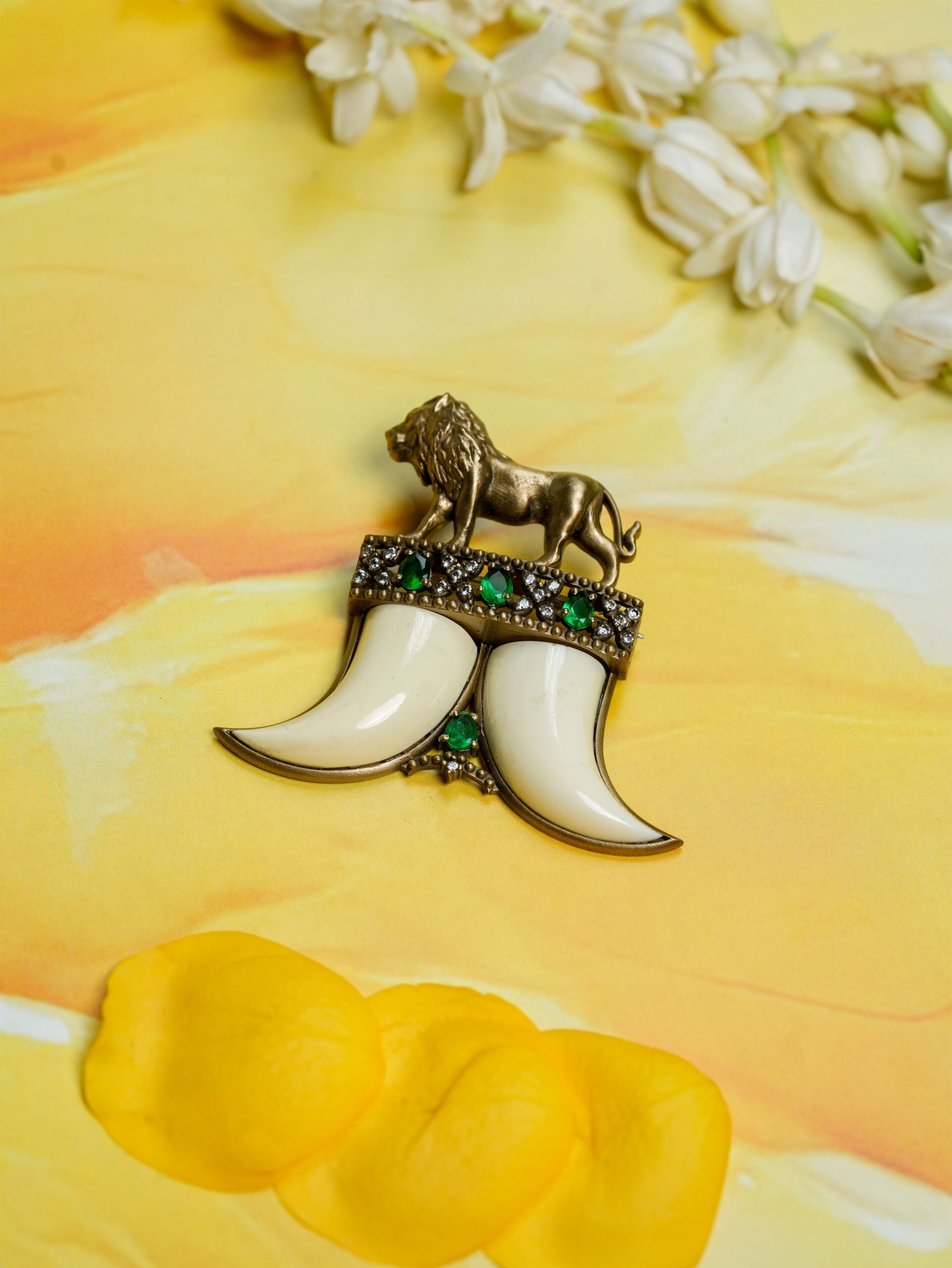 Commanding and regal, the Lion?s Tusk Brooch is a bold symbol of strength and legacy. Featuring a majestic lion standing tall above twin tusk motifs, this brooch is accentuated with radiant emerald stones and shimmering crystal details. The blend of ivory tones and antique gold creates an aura of dominance and refinement, making it the perfect statement accessory for men who carry authority with grace.