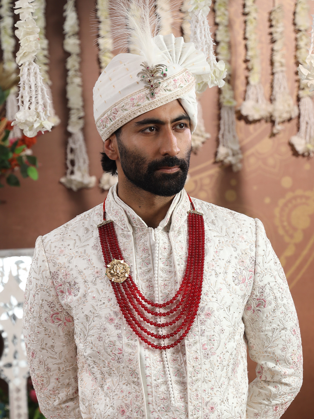 This mala celebrates the grandeur of Indian heritage, crafted by skilled artisans who preserve the timeless traditions of jewellery artistry. It is a symbol of prosperity, devotion, and royal elegance.The Ruby Lotus Mala features multiple strands of rich red beads, exuding vibrancy and strength. At its heart lies an ornate lotus-shaped pendant in antique gold finish, adorned with delicate detailing and green stone accents, symbolizing purity, renewal, and divine grace.Lightweight yet durable, this mala is perfect for pairing with a sherwani or bandhgala. A striking adornment for weddings and festive occasions, it brings together tradition, artistry, and regal sophistication.